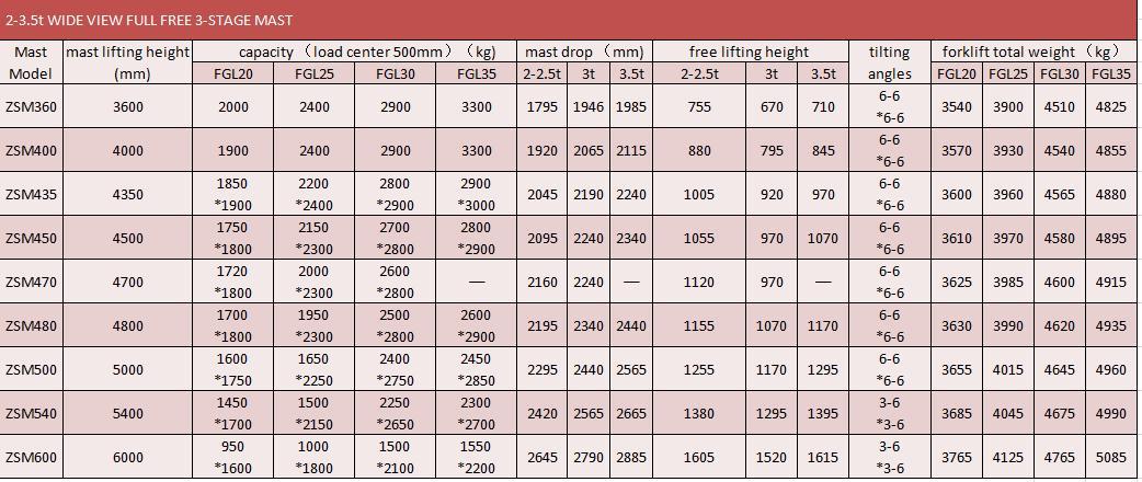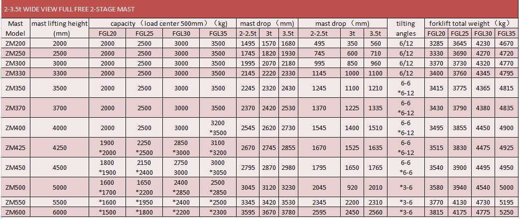 2.0T Špecifikácia stožiaru vysokozdvižného vozíka na benzín/LPG